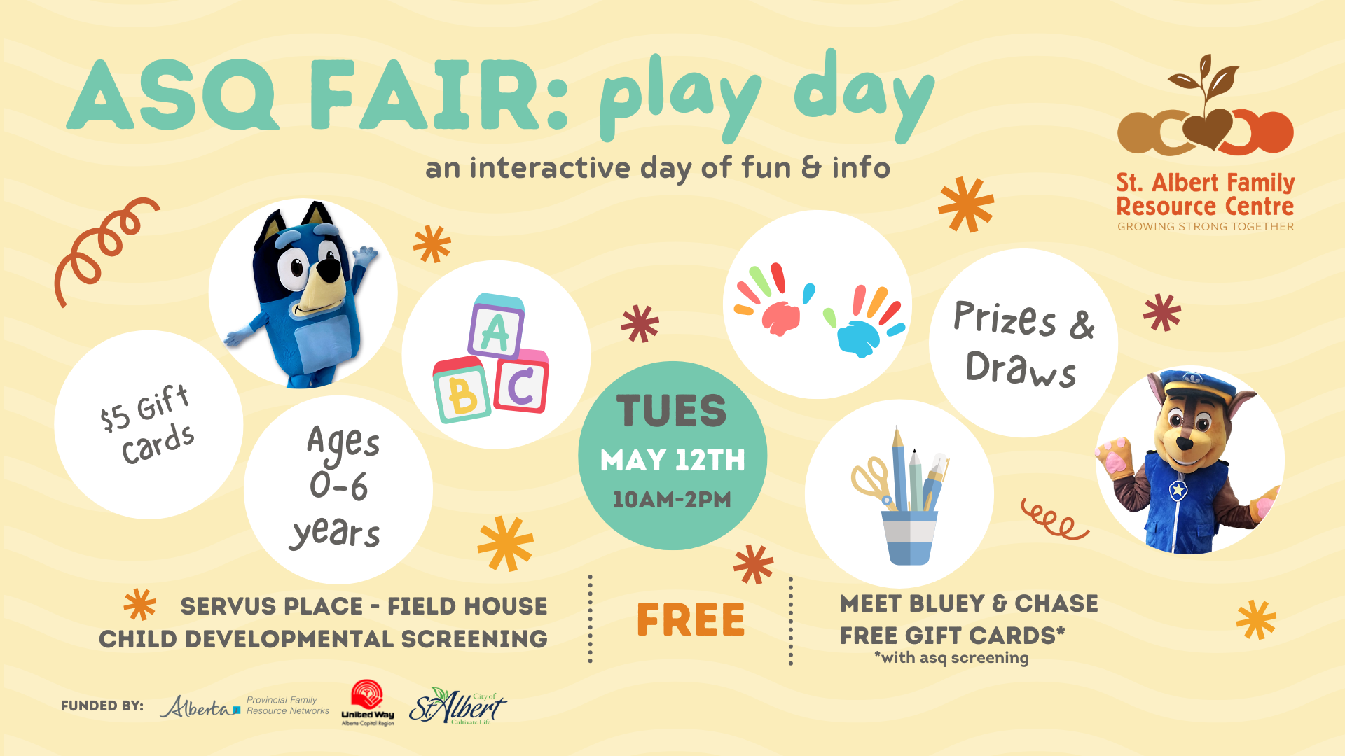 ASQ Fair: Play Day is taking place on May 12th , 2026 from 10am – 2pm at Servus Place (Field House)